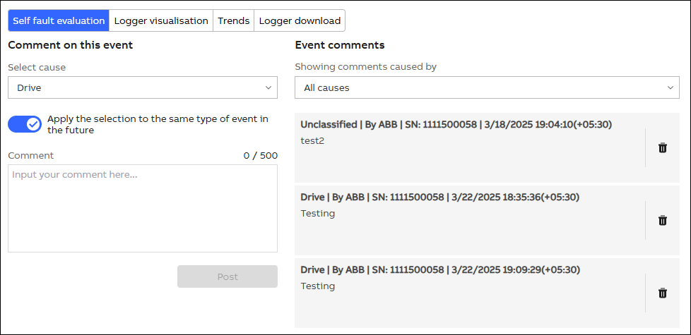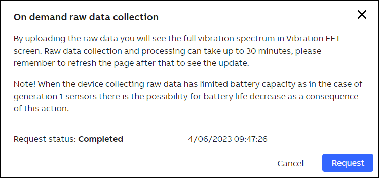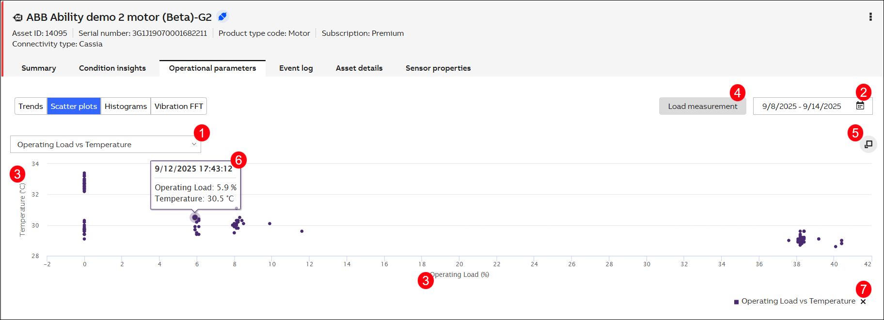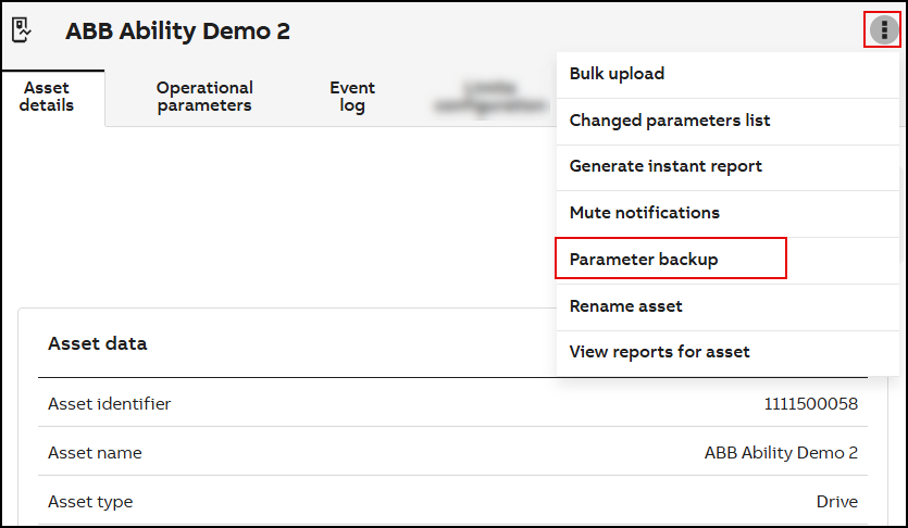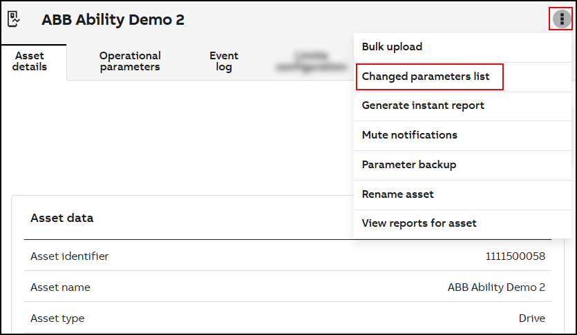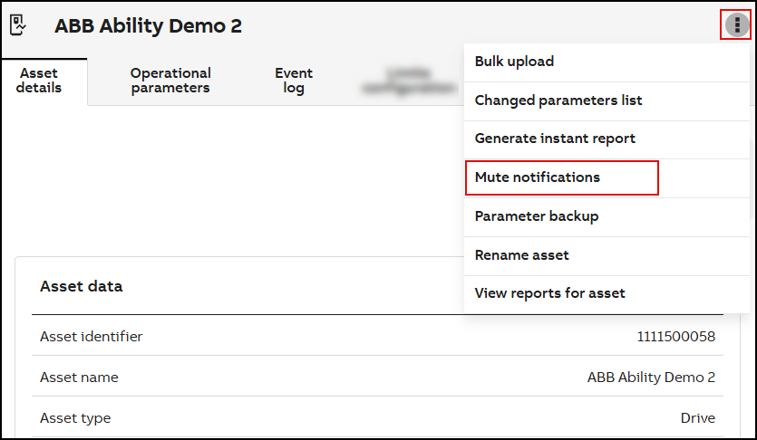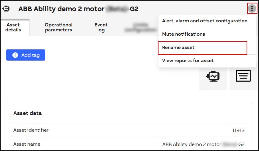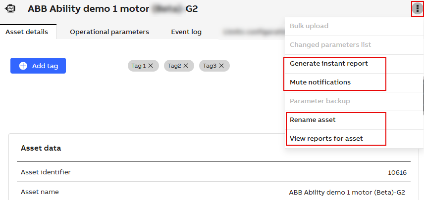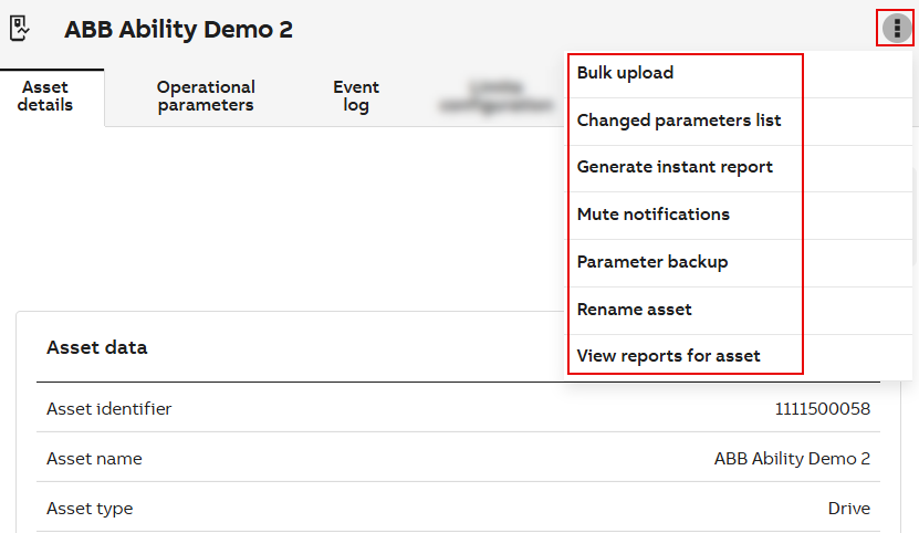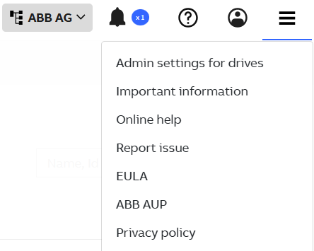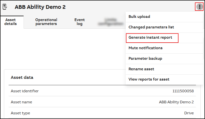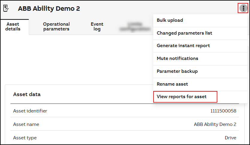 Report issue: Allows you to report an issue directly to the ABB support team. In the Report issue window, select the affected asset and provide required details of the issue and click Report. The function sends an email to the support team.