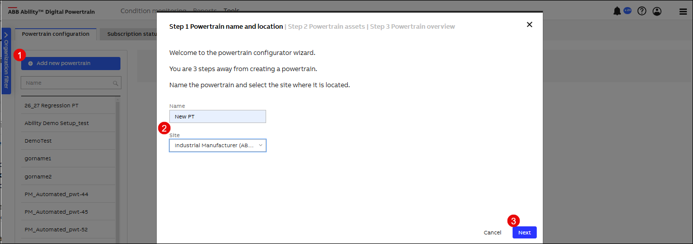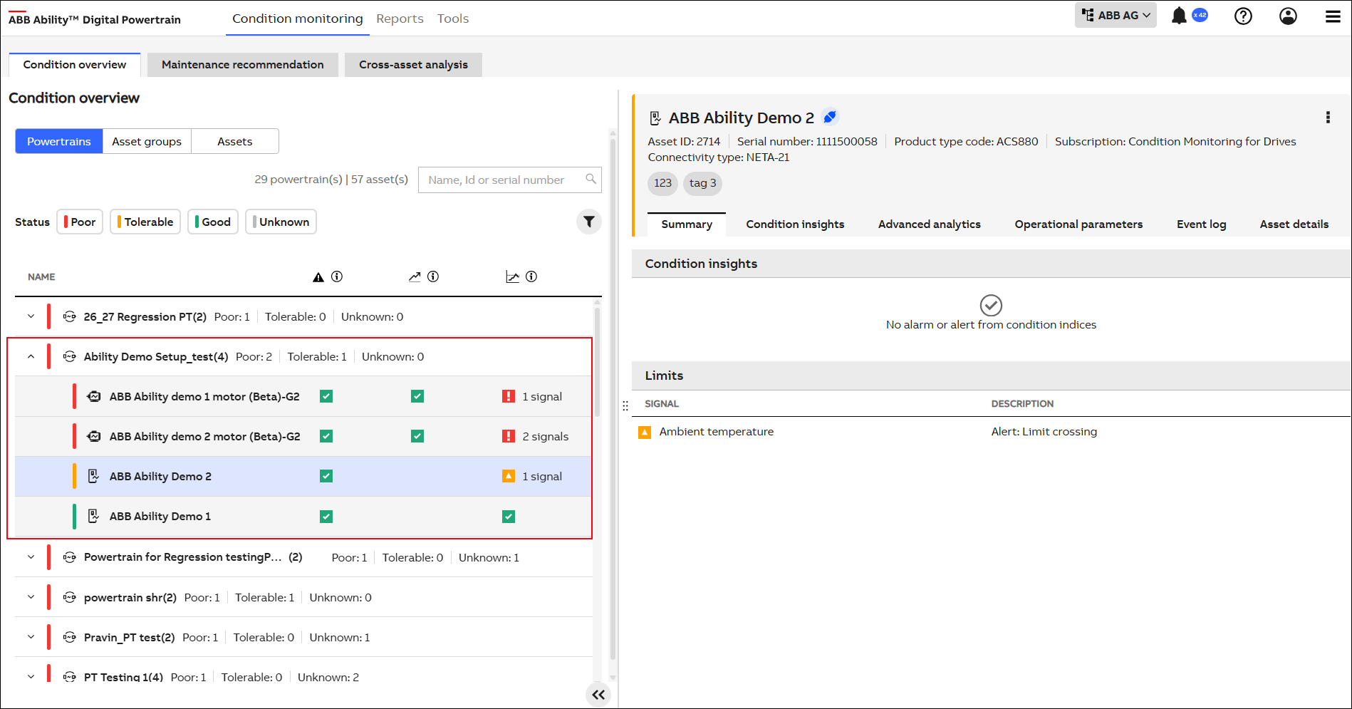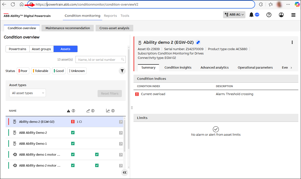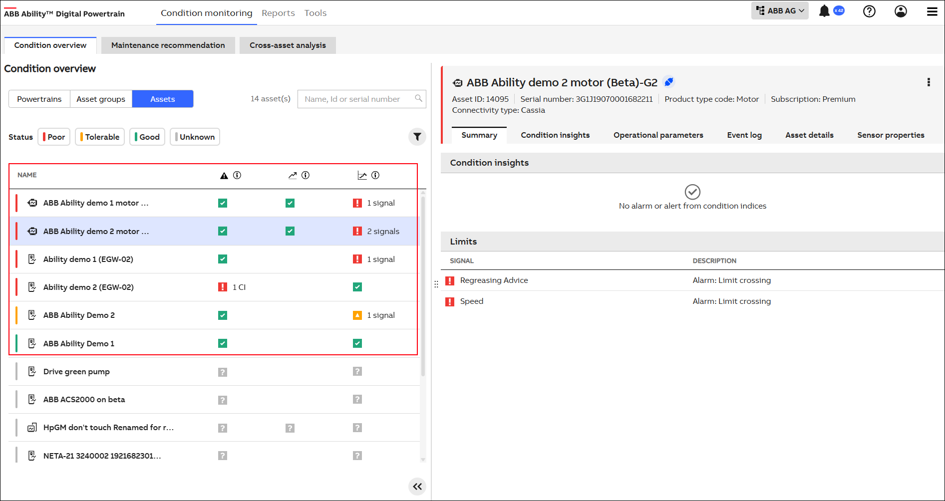 The Powertrain portal monitors the condition of assets such as drives, motors, and applications such as pumps. The monitored