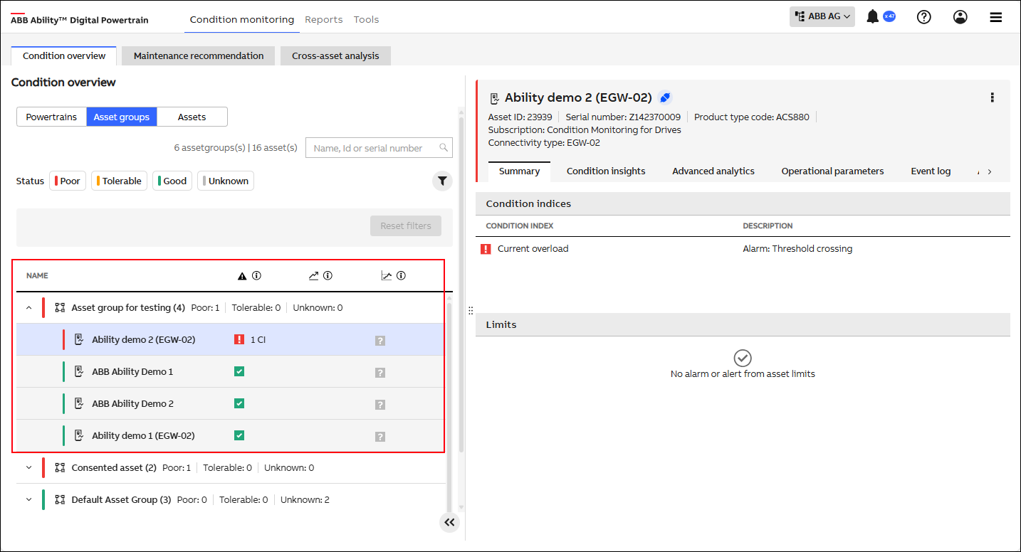 You can view the condition of Powertrains, Asset groups, and Assets that belong to your authorized organization. If you are