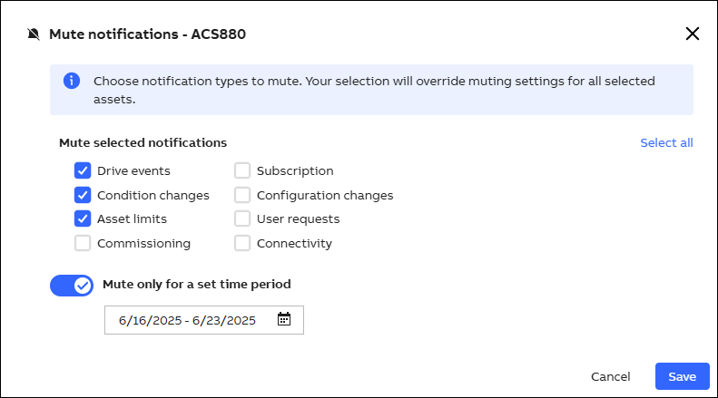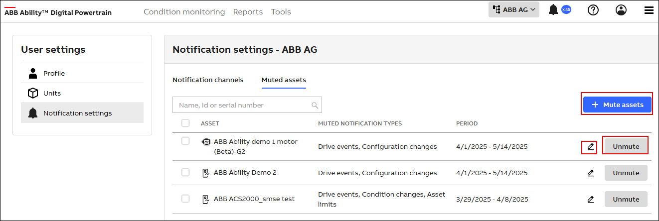 Mute asset notifications. For information on configuring notifications to muted assets, refer to Configure muted assets notification.