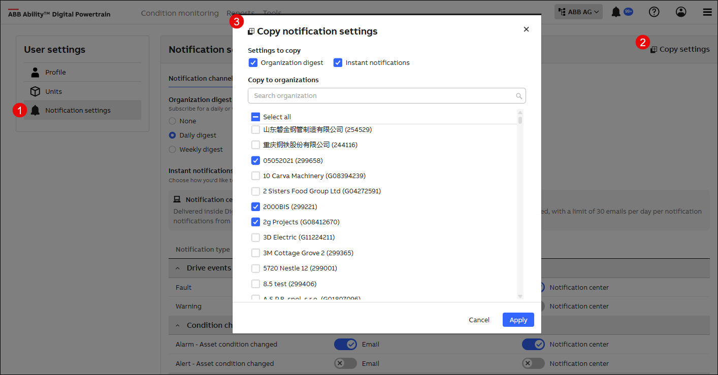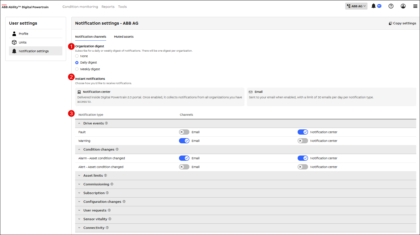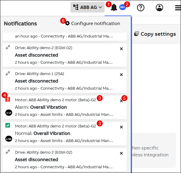 Notification center: Delivers notifications inside the Digital Powertrain 2.0 portal. The enabled notifications from multiple organizations are