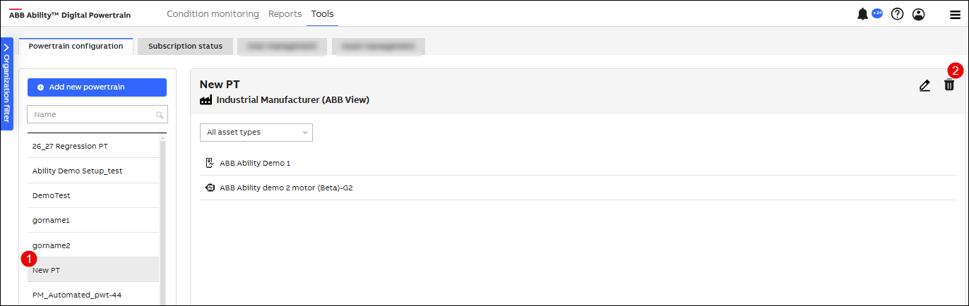 PT country admin: Can remove asset groups of all organizations that belong to the country within the Powertrain portal.
