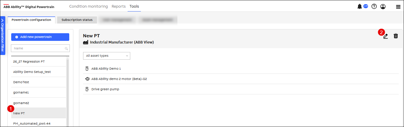 This section describes how to manage assets in organizations within the Powertrain portal.